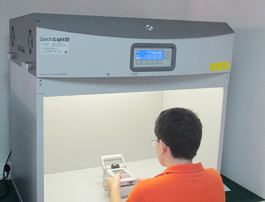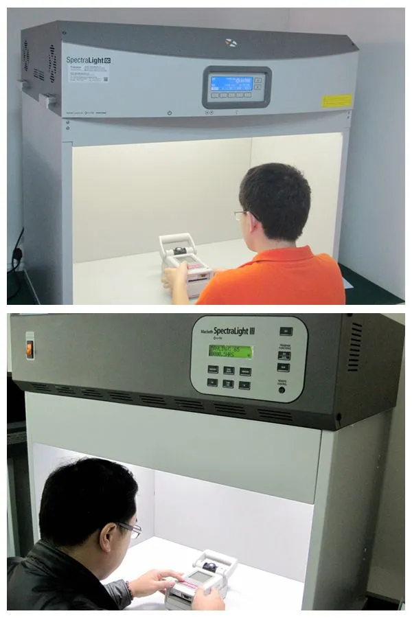 图一:三锦工程师在为客户现场校验爱色丽SPLIII型和SPLQC型标准光源箱